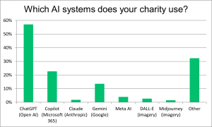 • Charities are using a wide range of AI systems, with the most popular being ChatGPT (57%), followed by Copilot (23%) and Gemini (14%).